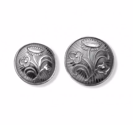 Stor og liten sølvknapp til nordlandsbunad (herrebunaden). Det originale nordlandssølvet fra Gullsmed Rørvik. Bunaden bruker 24 stk. Størrelse 20 mm Vekt 2,7gr
